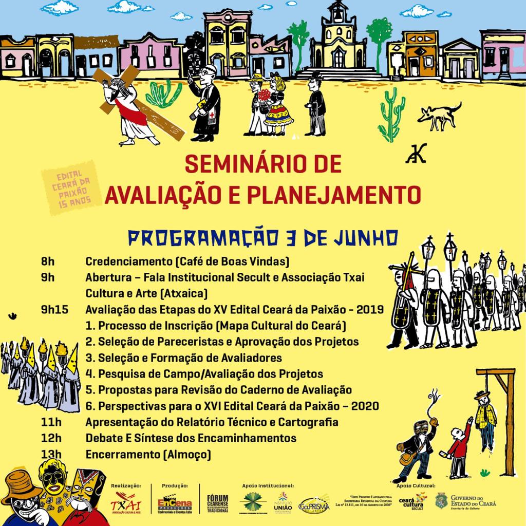 A Secretaria da Cultura do Estado do Ceará - Secult realiza, no dia 03 de junho, no local Auditório da SECULT 6º Andar, das 8h às 13h, o III Seminário de Avaliação e Planejamento Ceará da Paixão, com produção da Associação Txai Cultura e Arte - ATXAICA, entidade contemplada no XV Edital Ceará da Paixão 2019. A atividade se propõe a avaliar o Ciclo Pascal e traçar caminhos e diretrizes para o Ciclo de 2020.