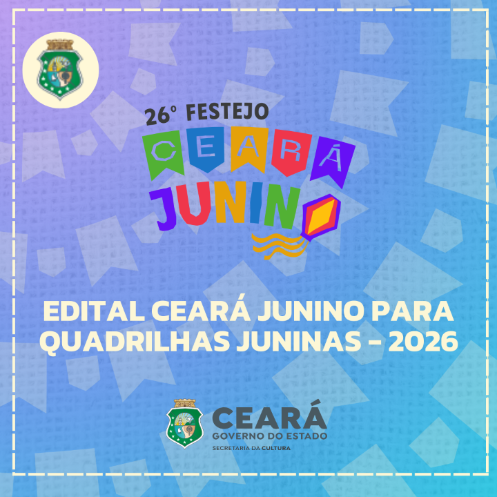 O Edital Ceará Junino para Quadrilhas Juninas, em sua 26ª edição, é uma iniciativa contínua de fomento. Seu objetivo é apoiar a manutenção e a renovação de grupos e manifestações culturais que integram o Ciclo Junino. Este edital faz parte das políticas estaduais de reconhecimento e promoção do patrimônio imaterial cearense, com foco no Ciclo Junino, alcançando todas as regiões e municípios do Ceará.